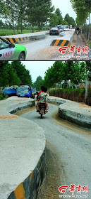 Mak aih extrim abis China nih. Di Provinsi ShanXi pihak berkuasa tempatan sudah fedup dengan pemandu yang tak mematuhi had kelajuan di Lebuhraya Jing Zhuang. Instead of meletakkan speed bumps, diorang letak "side bumps" sepanjang 100 kaki panjang dan 2 kaki tinggi di tepi jalan. Akibatnya jalan yang lurus jadi bengkang bengkok. Nak tak nak kena bawak slow jugak pasal no way boleh bawak laju menerusi jalan ini sekarang. Adakah ini bodoh atau genius? aku rasa kalau orang ramai dah degil sangat nak merempit, solution yang diambil oleh PBT Shanxi agak genius! LOL